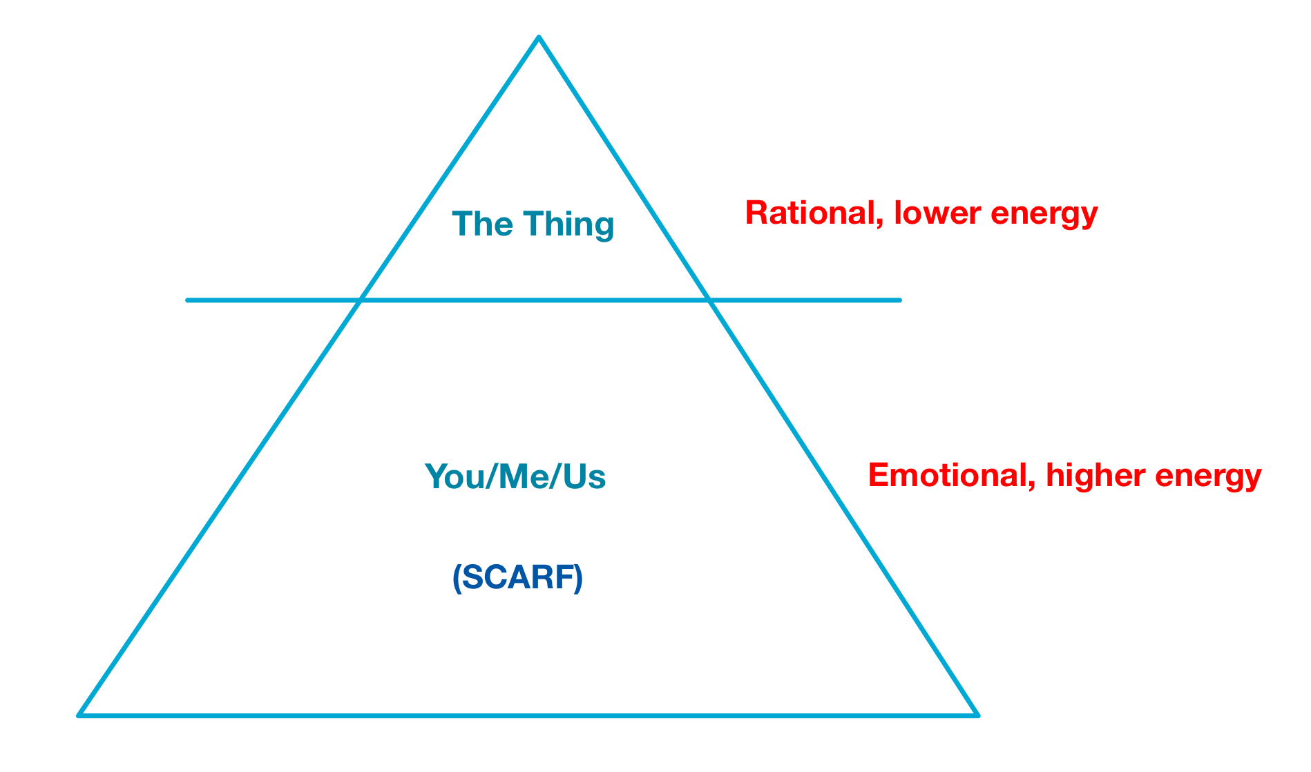 A useful place to go further here is the SCARF model which looks at common emotional triggers in social situations (Security, Certainty, Autonomy, Relatedness and Fairness). If somethings “off” in the “Thing” conversation, it’s likely some part of the SCARF model is being pushed on in the “You/Me/Us” conversation.